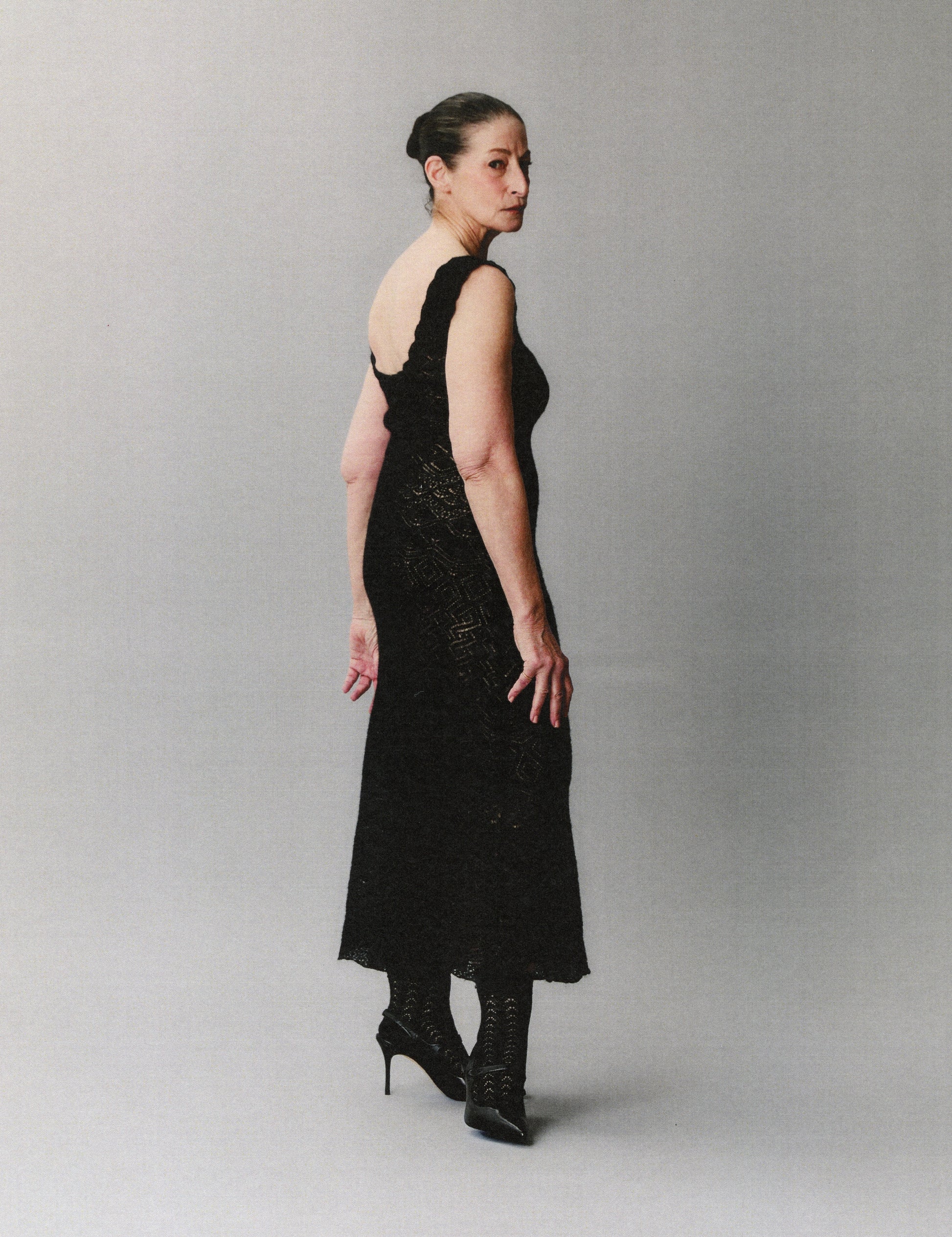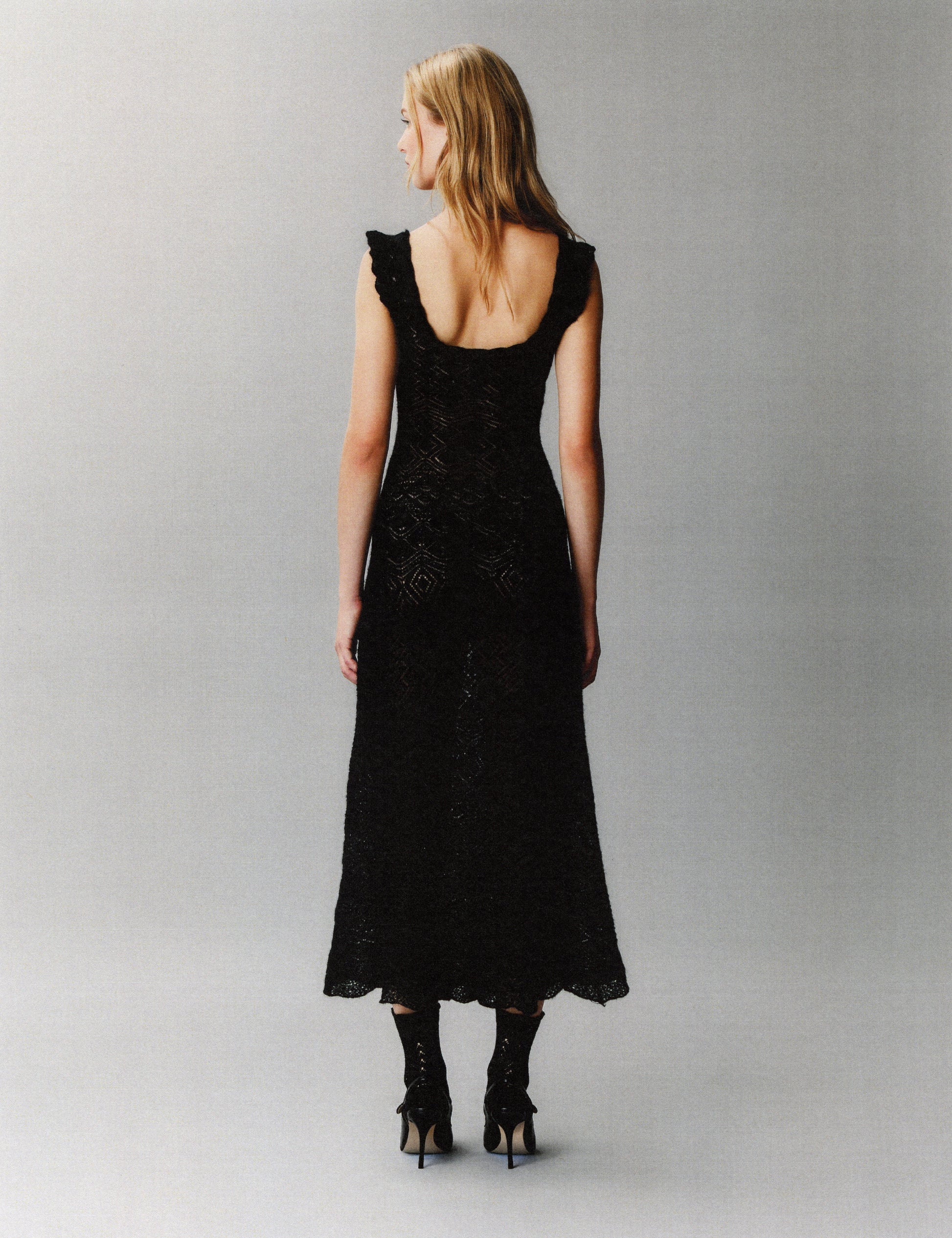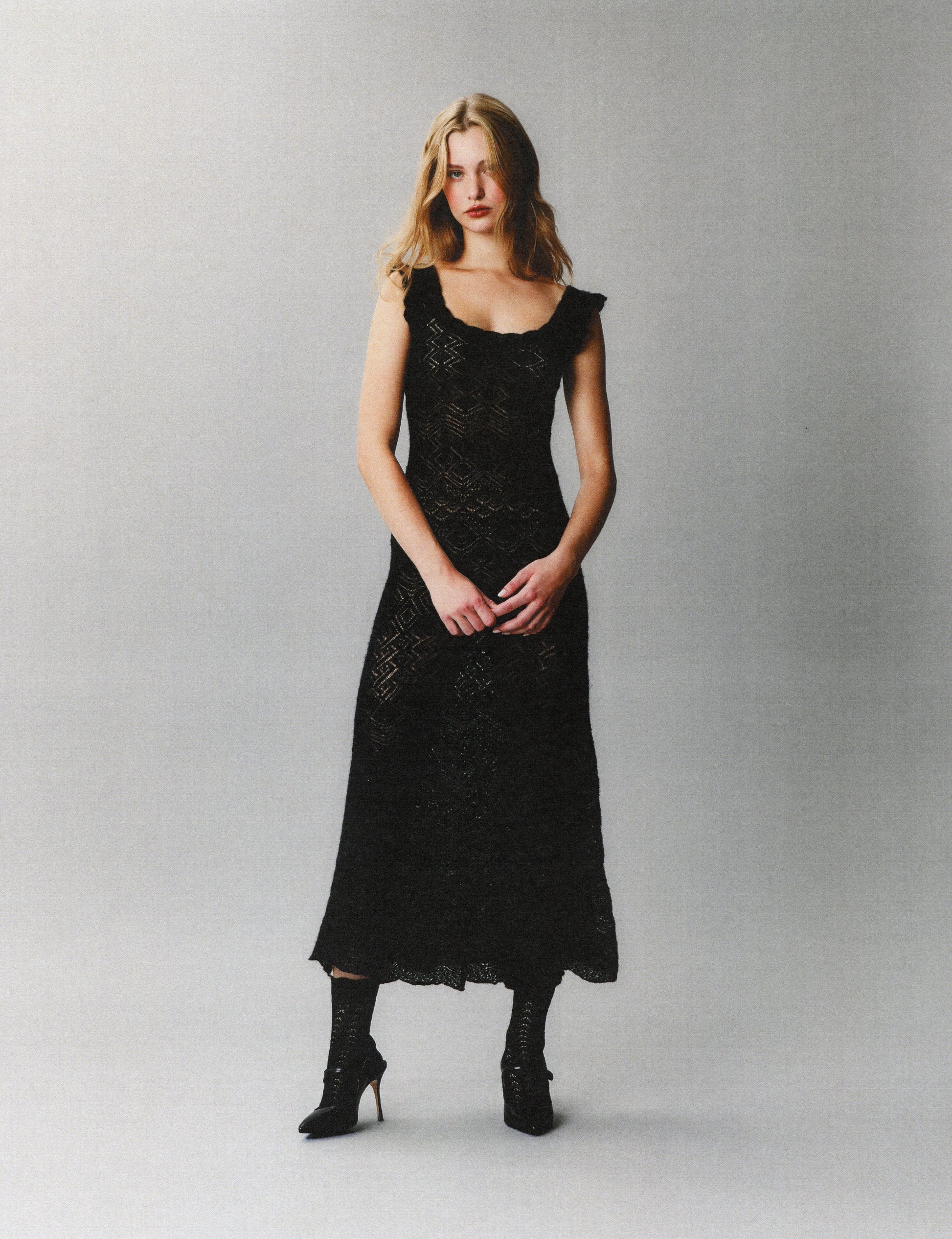 The Vaughn Pointelle Dress evokes the nostalgia of vintage Fair Isle, reinterpreted through openwork rendered in a dreamlike state—delicate, luminous, and ever-shifting. Lace-like pointelle traces the body, framed by soft scalloped trim at the neckline and armholes. The back neckline falls to a quiet curve, its subtle drop lending elegance to the silhouette. The hem echoes that softness in a gentle scallop that stirs with movement, catching light as it shifts.